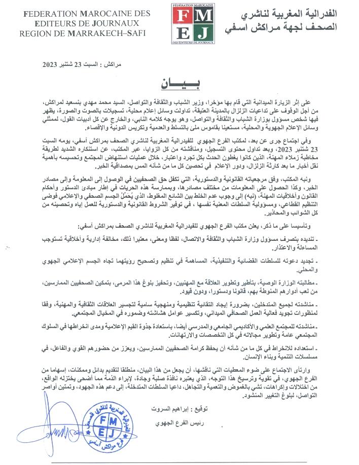 وفي اجتماع جرى عن بعد، لمكتب الفرع الجهوي للفيدرالية المغربية لناشري الصحف بمراكش /آسفي، يومه السبت 23 شتنبر 2023، وبعد تداول محتوى التسجيل، ومناقشته من كل الزوايا، عبر المكتب، عن استنكاره الشديد لطريقة مخاطبة زملاء المهنة، الذين كانوا يغطون الحدث بكل تجرد واعتبار، خلال عمليات استنهاض المجتمع وتحسيسه بأهمية نقل أخبار ما بعد كارثة الزلزال، ودور الإعلام في تحصين كل ما من شأنه المس بمصداقية الخبر.